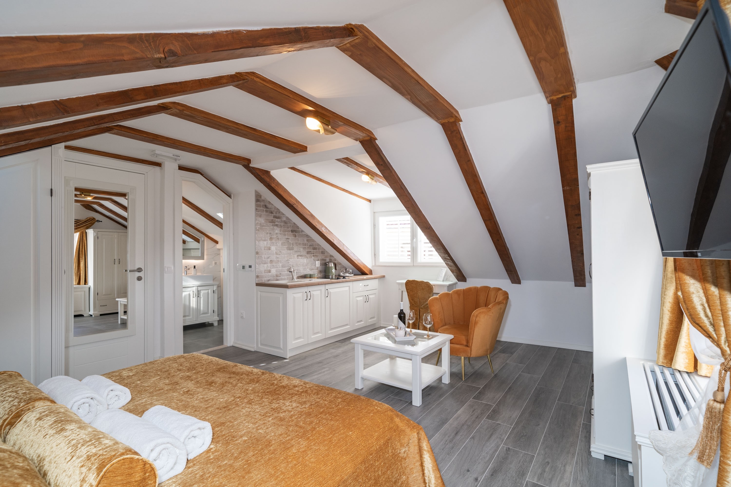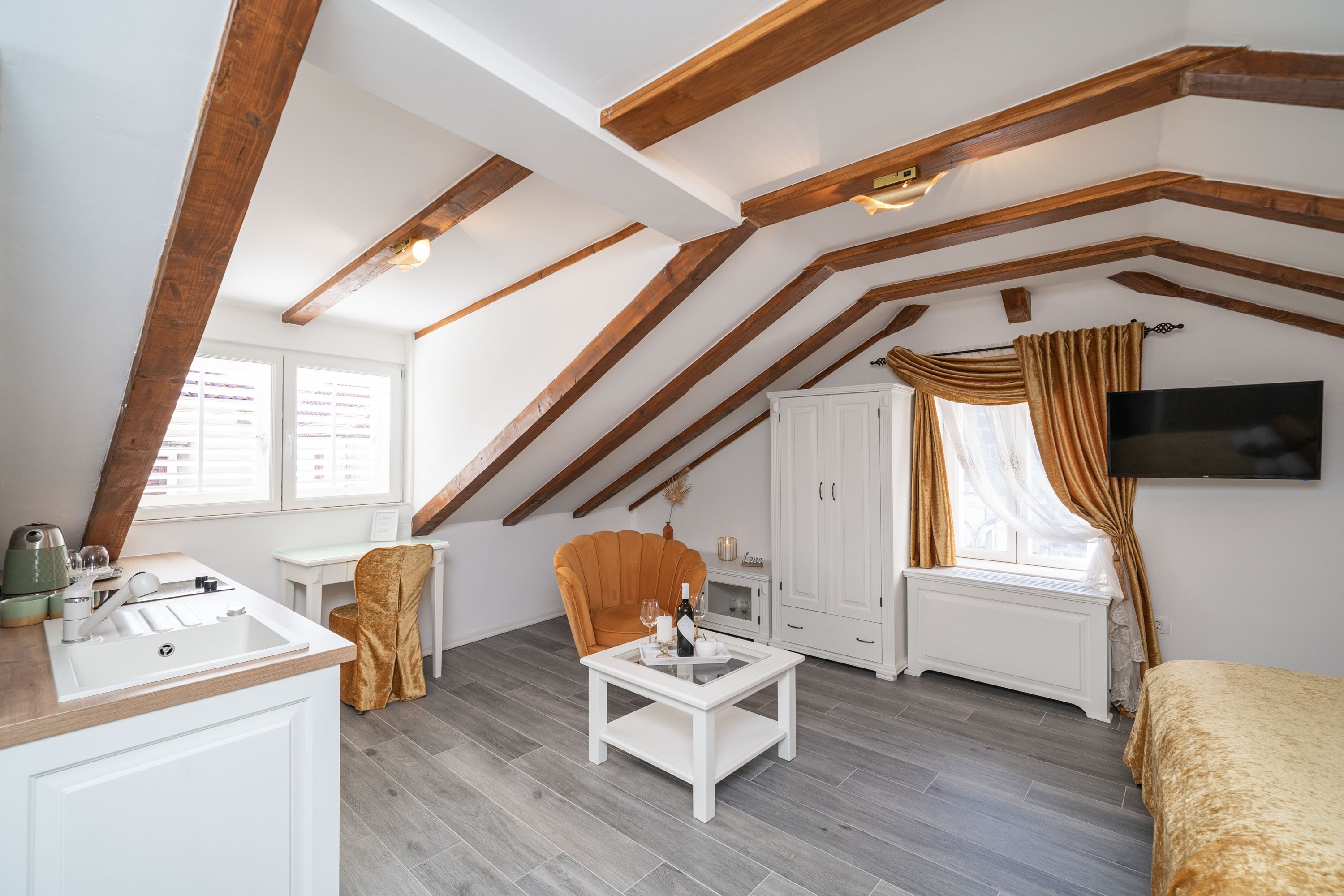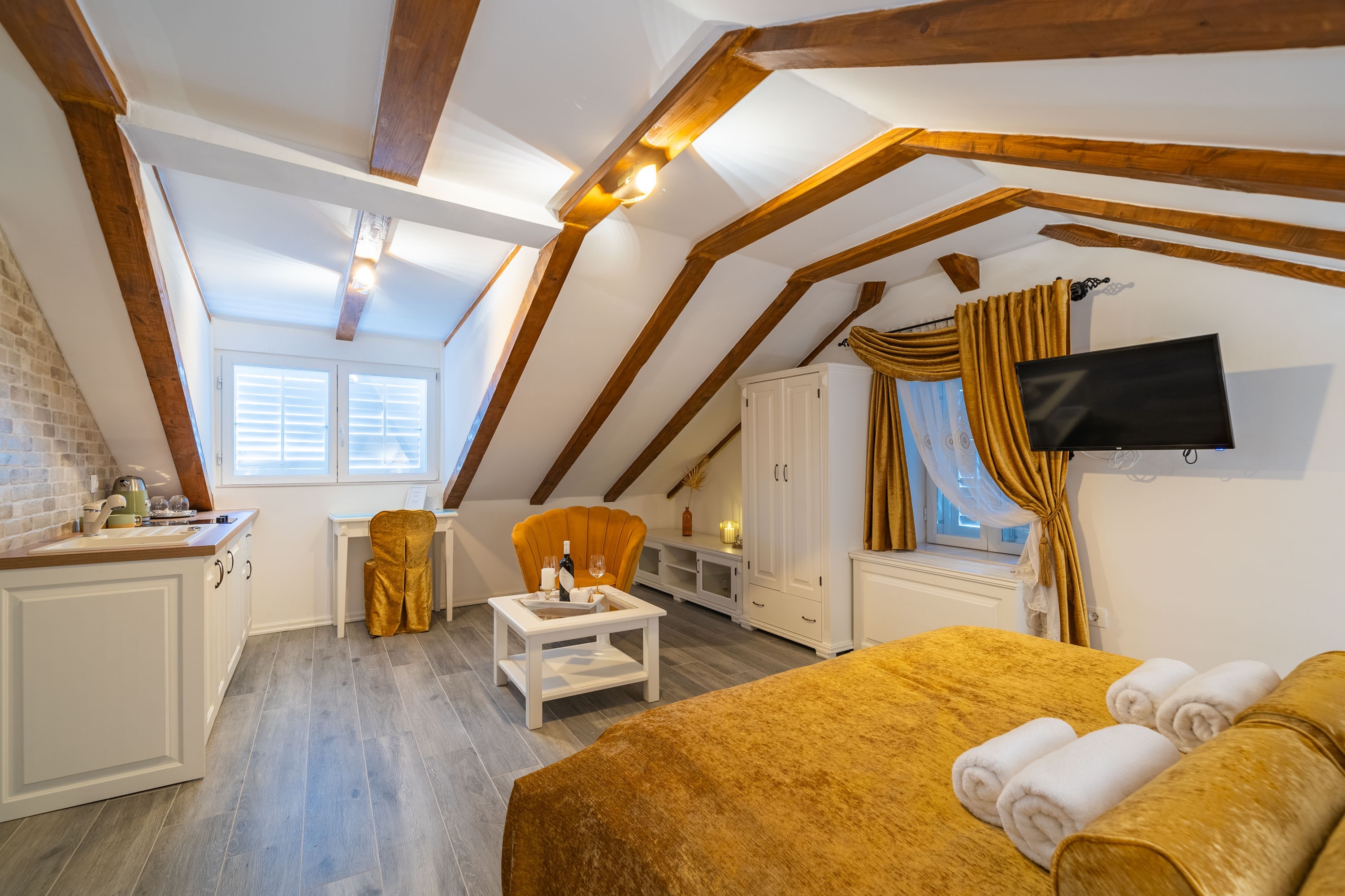 Studio flat can accommodate 2 guests. Beds are situated in 1 sleeping rooms, within 24m2. There is no balcony or terrace in the reserved accommodation unit. INCLUDED IN THE PRICE: tourist tax, final cleaning, air-conditioning, central heating, parking, internet, iron, ironing board, hairdryer. The availability of additional services for your chosen dates of stay, as well as their prices (if none are listed) must be checked ahead of time. Any additional services not shown in the price calculation are payable directly to the property owner and only if used by the visitor. Discounts to the base price: free day 14=13 (for reservations of 14 or more days you get one free day for the stay until 31122026).