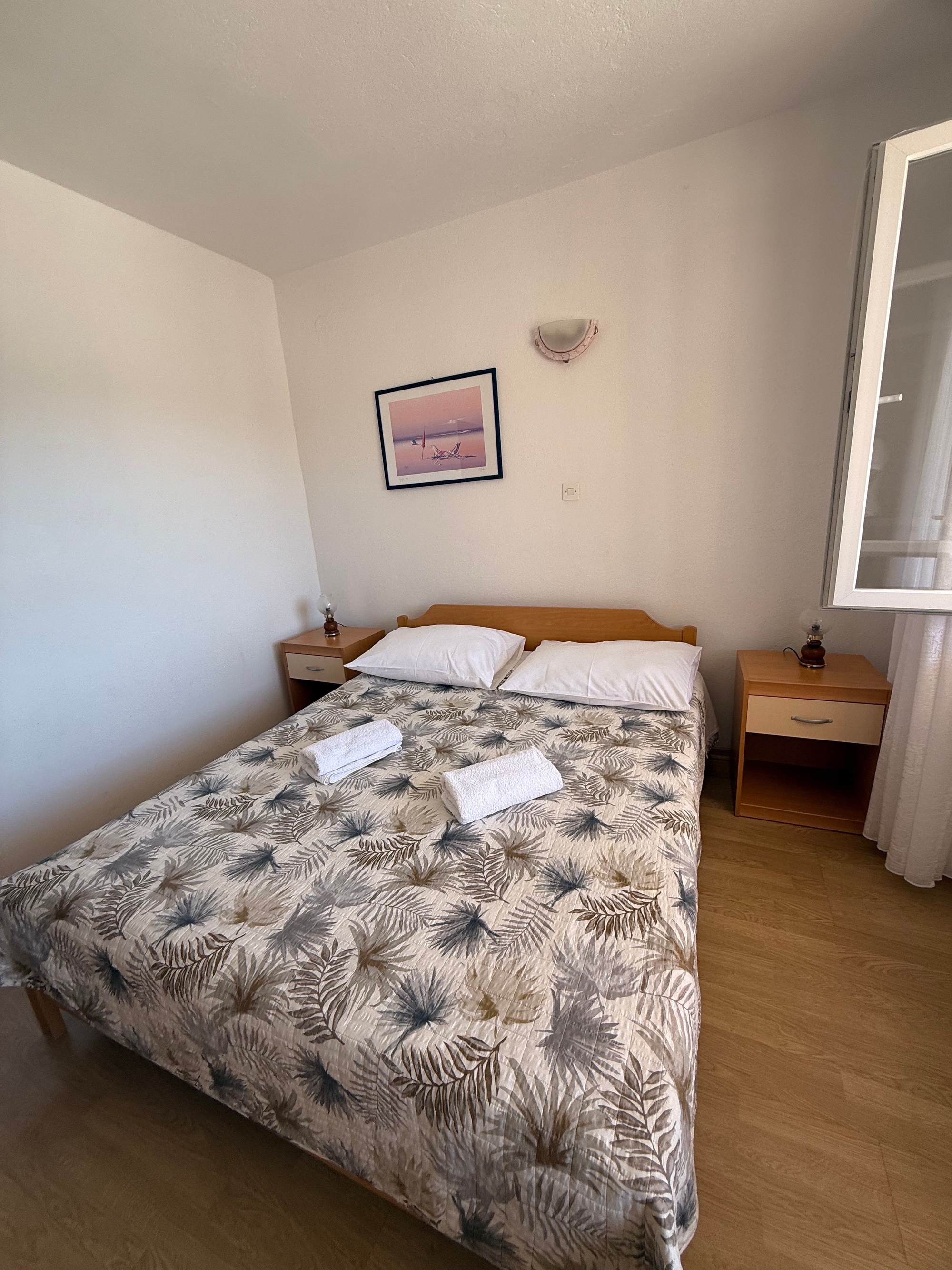 Apartment can accommodate 4 guests. Beds are situated in 1 sleeping rooms, but also in the living room, within 28m2. Guests can use a private terrace to enjoy the warm summer evenings. The apartment offers the sea view. Food can be prepared using barbecue which is shared with other guests too. This accommodation unit welcomes pets at an additional charge. INCLUDED IN THE PRICE: tourist tax, final cleaning, air-conditioning, parking, internet, iron, ironing board, hairdryer. OBLIGATORY ADDITIONAL COSTS: short stay fee (surcharge depending on a number of booked nights: 30% - 1, 20% - 2, 10% - 3). OPTIONAL ADDITIONAL COSTS: pets (€7.00 per night). The availability of additional services for your chosen dates of stay, as well as their prices (if none are listed) must be checked ahead of time. Any additional services not shown in the price calculation are payable directly to the property owner and only if used by the visitor. Discounts to the base price: free day 14=13 (for reservations of 14 or more days you get one free day for the stay until 31122026).