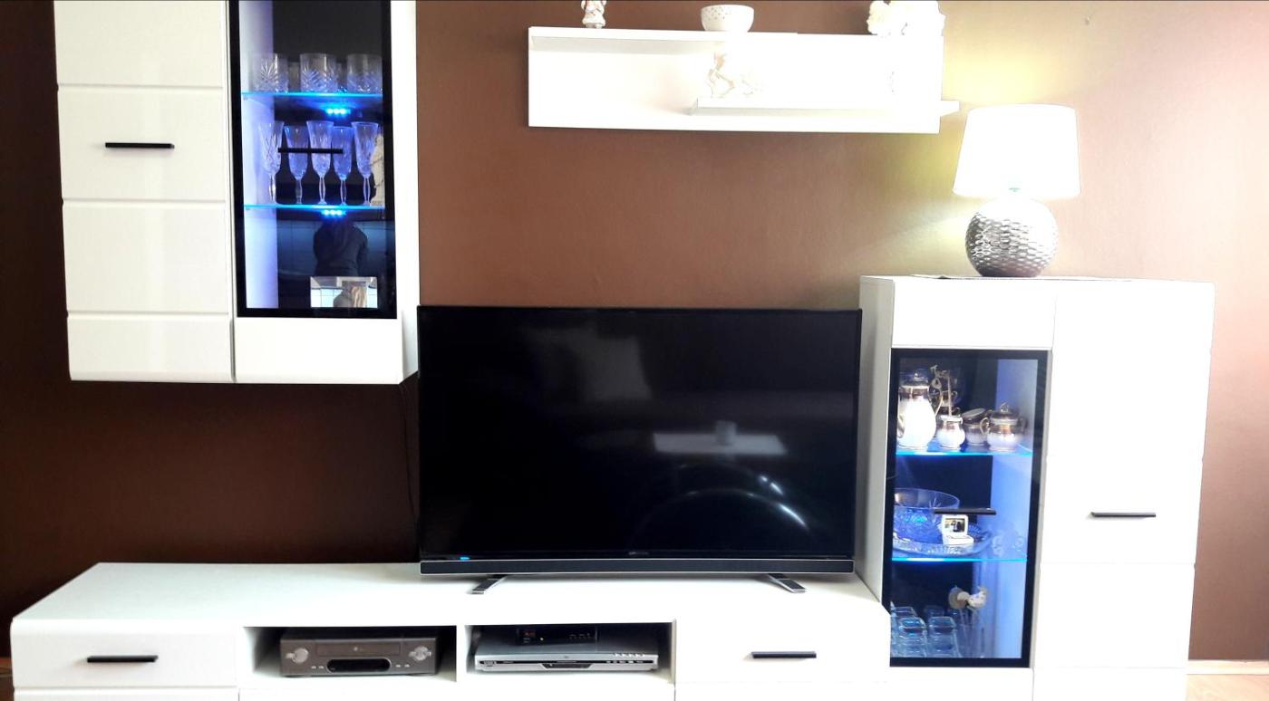 The apartment features 1 bedroom, a TV with satellite channels, a fully equipped kitchen with an oven and a fridge, a washing machine, and 1 bathroom with a shower.